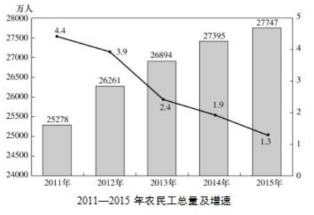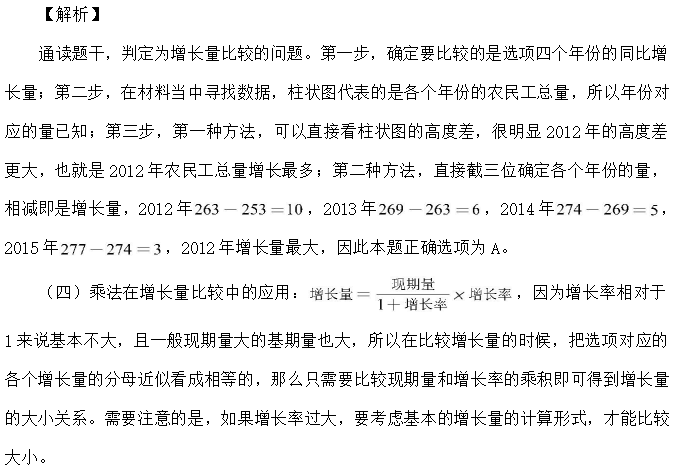 【例 3】2012 年-2015 年,我国农民工总量增长最多的年份是: